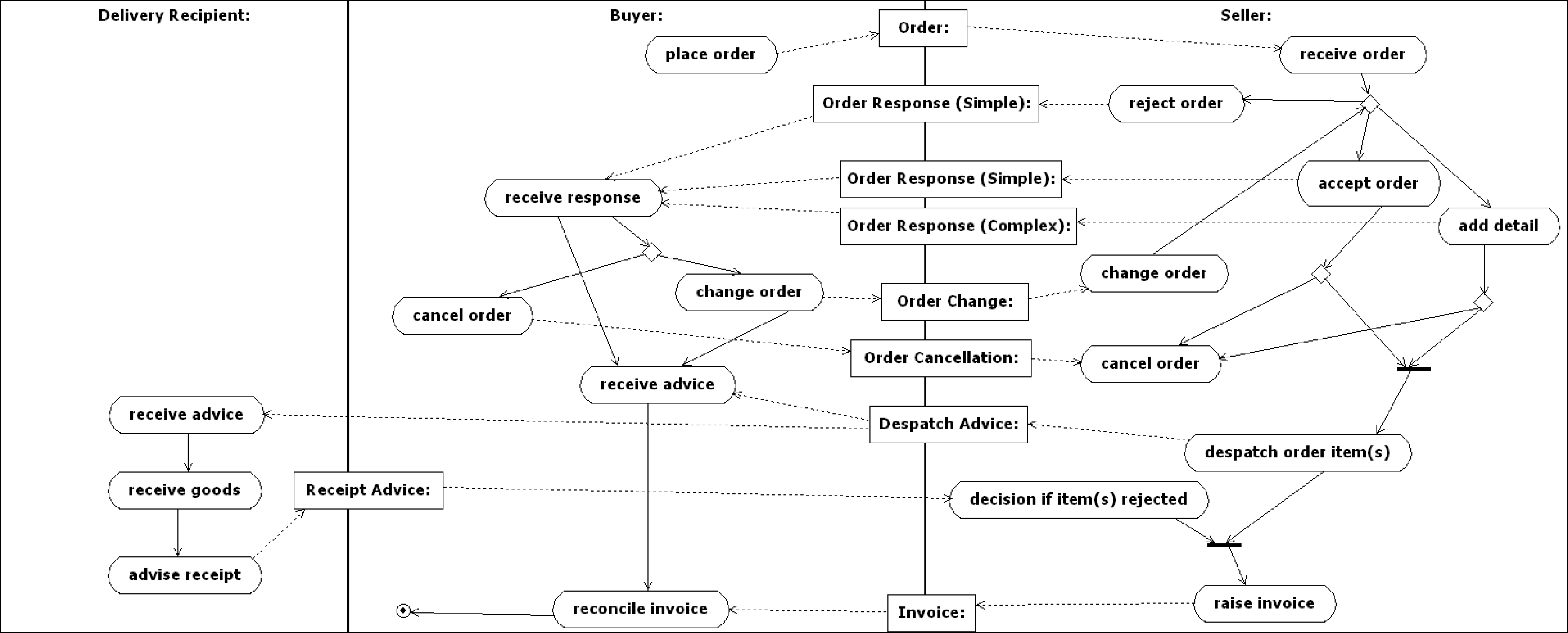 This model addresses the requirements of a basic, usable trading cycle from Order to Invoice between Buyer and Seller. It includes specifications for:
